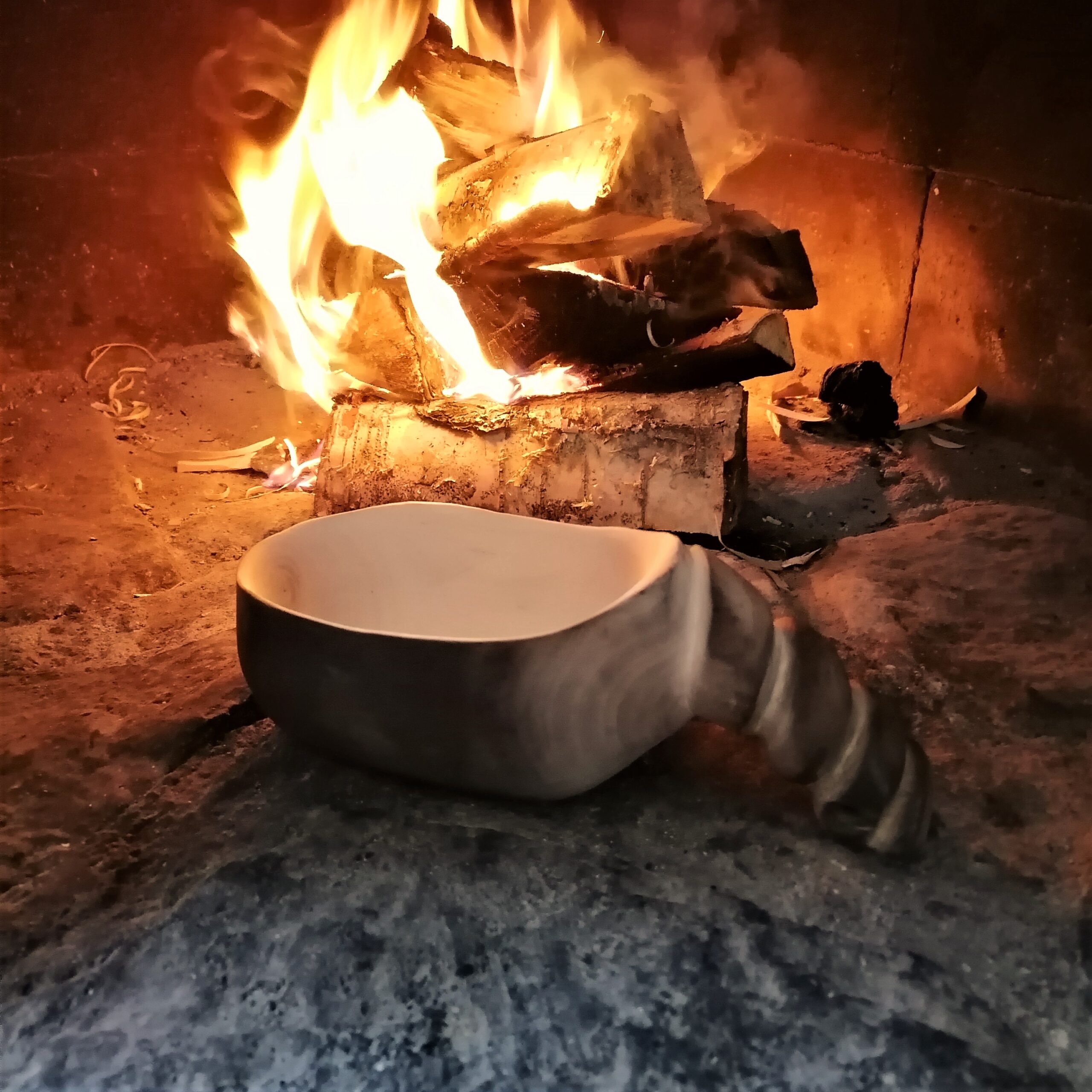 Holding around 250 ml, with a twisted handle and an outer surface traditionally burned over open birchwood fire, every Kuksa has its own rustic character – warm, bold, and full of life.